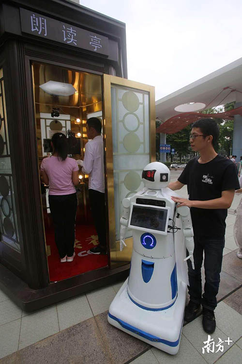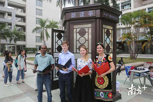 來到朗讀亭的有華工離體老教授,現(xiàn)任校領(lǐng)導(dǎo),中外在校生,華工研制的機器也進(jìn)亭朗讀了。
