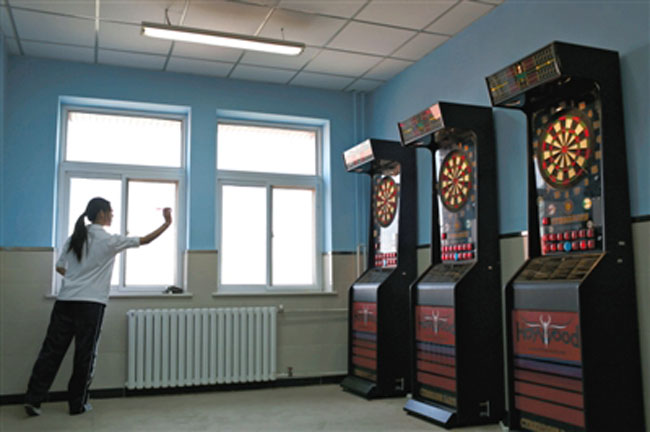 可能在一些學(xué)校的角度覺得,學(xué)生的功課那么忙,玩飛鏢是不是不務(wù)正業(yè),57中卻破天荒地在學(xué)校成立了飛鏢隊,甚至把飛鏢運動引入選修課程中,成為全國首位開設(shè)飛鏢課程的學(xué)校。當(dāng)其他學(xué)校還在為學(xué)生的加強眼保健操的時候,57中已經(jīng)把練習(xí)飛鏢作為保護學(xué)生眼力,緩解眼部疲勞的途徑。到現(xiàn)在為止,飛鏢運動都已經(jīng)在學(xué)校駐足三年,飛鏢機已經(jīng)普及開來,一字排開,成為校園大禮堂上的一道倩影。