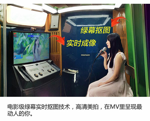 如果有需要加入特效的拍攝場景,基本是在一個綠色布景前完成,讓使用者置身于虛幻場景之中。綠幕摳像拍攝技術在當今的影視制作中是一種非常普遍的拍攝手法。如果把這種綠幕技術應用在迷你ktv唱歌機上又有什么效果呢?