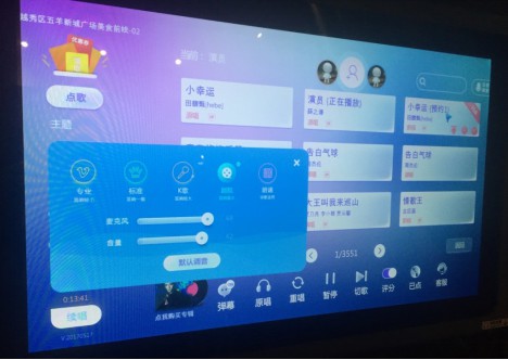 一般例如友唱、哇屋的效果音與傳統KTV麥克風音效選擇并無二致,基本是回聲的效果,不是專業的混響效果音,并且回聲效果音時間很長。呈現方式沿用了傳統的觸屏式調音,專業、標準、K歌、劇院,這四種分別代表混響較小、混響一般、混響較大、混響最大。劇院混響效果最明顯,但因為延時時間長,有些影響聲音的清晰度,聽到的聲音會比較悶,而且唱歌時如果聲音比較大,地板會有振動的感覺。