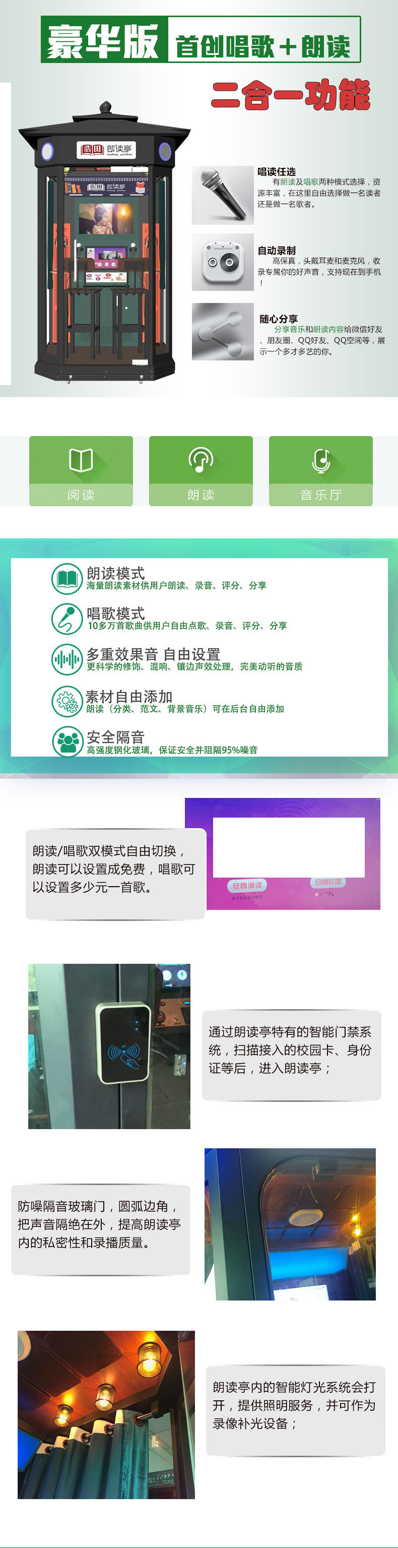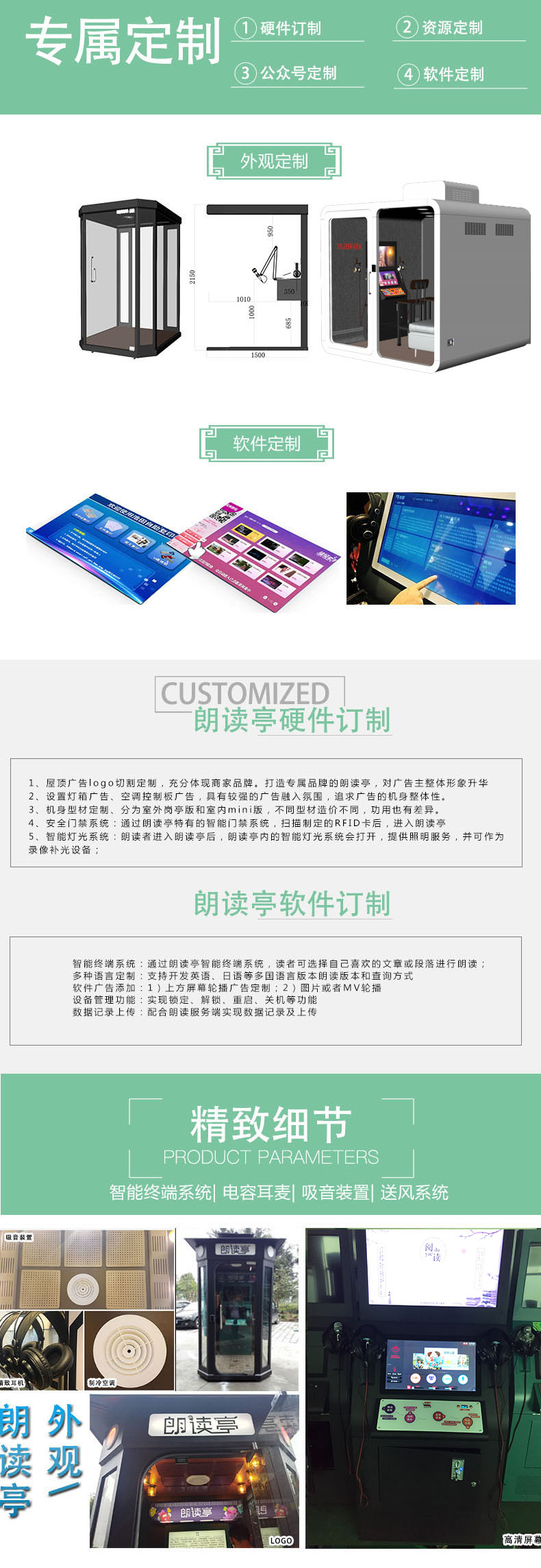 一:語音朗讀亭集成了專業的音頻設備、照明系統、隔音系統等,讓您在絢麗的燈光和背景音樂的渲染下,盡情地在文字中放飛想象,在朗讀中感悟人生。